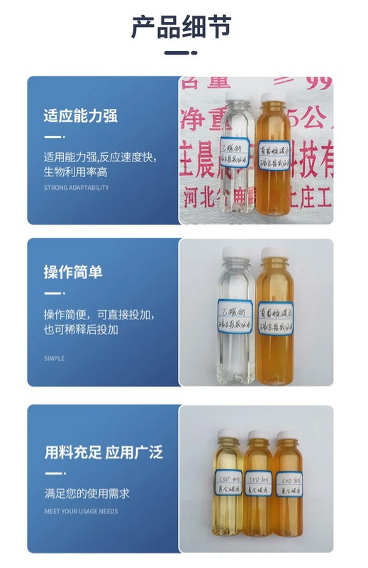 產(chǎn)品為無色、無刺激性氣味的液體,組分為小分子有機(jī)酸、糖類以及生物提取物等,具有極高的可生化性.可廣泛應(yīng)用于污水處理系統(tǒng)中,以解決碳源不足而導(dǎo)致的出水總氮偏高問題.提高污水處理系統(tǒng)的反硝化能力,同時對強(qiáng)化生物除磷也有很好的效果。