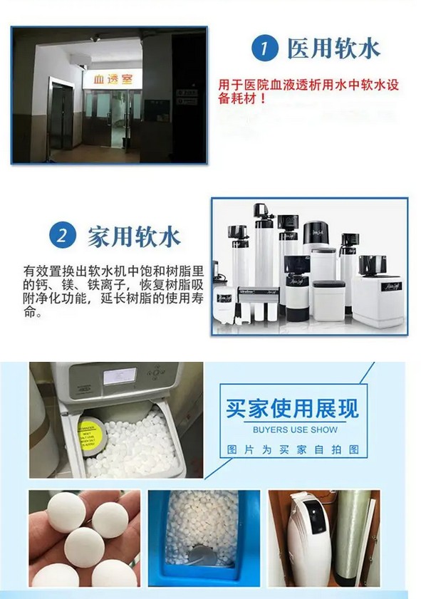 軟水機專用鹽,又名離子交換樹脂再生劑。其主要化學成分為氯化鈉(NaCl),由于軟水機的日常維護和樹脂還原需要,要求含量在99.5%以上,一般形狀為球劑。