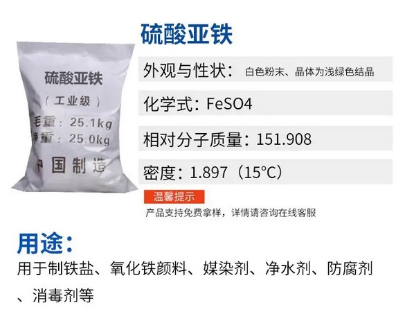 · 沉淀作用:在水處理中,硫酸亞鐵可以與水中的懸浮物、膠體等結(jié)合,形成較大的顆粒并沉淀下來(lái),有助于凈化水質(zhì)。