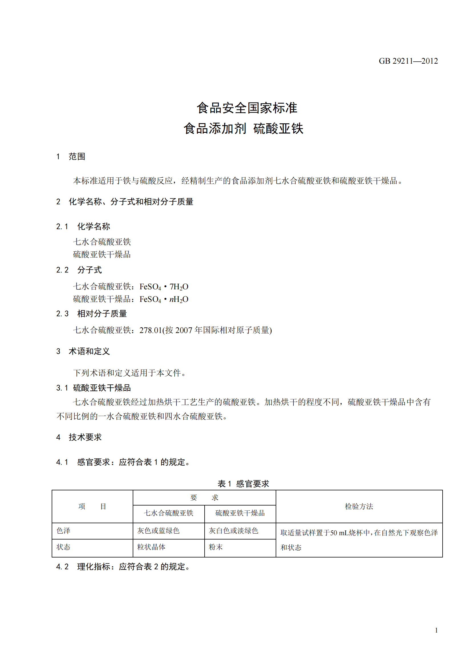 本標準適用于鐵與硫酸反應,經精制生產的食品添加劑七水合硫酸亞鐵和硫酸亞鐵干燥品。